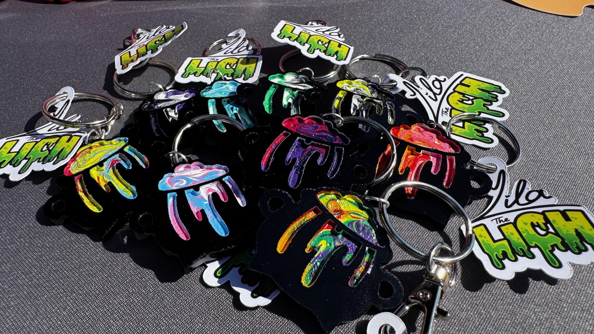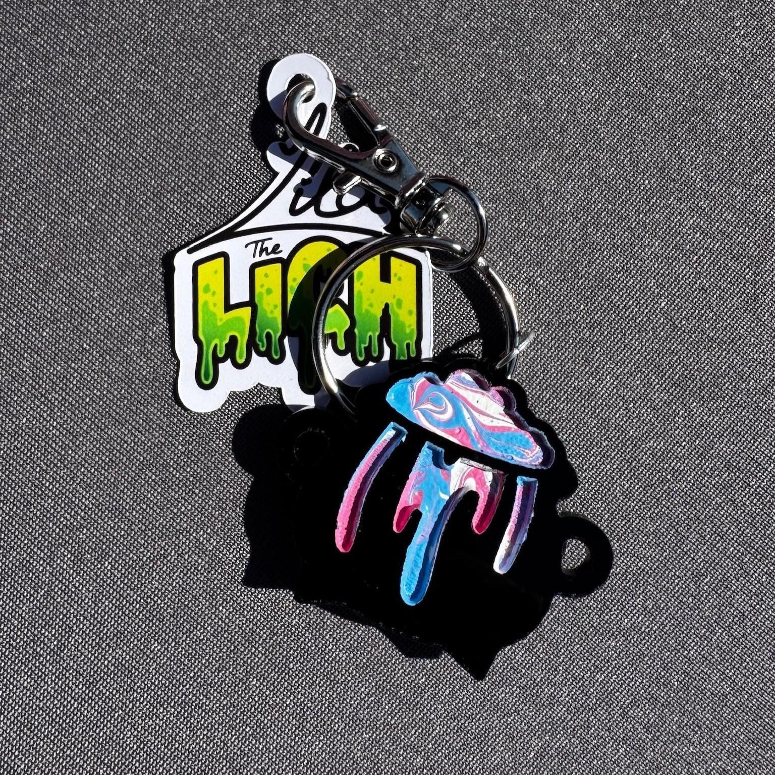 A small acrylic cauldron with Pride flag colours 'bubbling' out! Connected to a keychain ring with jewellery wire. All is self-made, from vector design to Print to adding the colours.